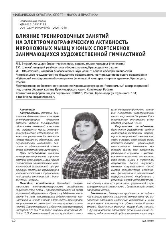 ВЛИЯНИЕ ТРЕНИРОВОЧНЫХ ЗАНЯТИЙ НА ЭЛЕКТРОМИОГРАФИЧЕСКУЮ АКТИВНОСТЬ ИКРОНОЖНЫХ МЫШЦ У ЮНЫХ СПОРТСМЕНОК ЗАНИМАЮЩИХСЯ ХУДОЖЕСТВЕННОЙ ГИМНАСТИКОЙ