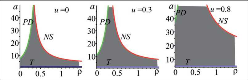 Fig. 1. Stability domain of the nontrivial equilibrium (2) with variations in the parameter u values. T, PD, NS are the lines corresponding to the transcritical bifurcation, the period-doubling bifurcation and the Neimark-Sacker bifurcation, respectively собственных чисел через -1 и сопровождается рождением предельного 2-цикла. При р > 1/3 потеря устойчивости может произойти только при комплексно-сопряженных корнях характеристического уравнения, при переходе |л| через 1, и сопровождается появлением предельных инвариантных кривых. Здесь рост значений параметра ρ приводит к быстрому сужению диапазона устойчивости, т.е. возникновение сложно организованных колебаний численности происходит при более низких значениях репродуктивного потенциала. Следовательно, как только вклад предыдущего поколения в лимитирование воспроизводства популяции начинает превосходить вклад текущего поколения, так при все более низких значениях репродуктивного потенциала возникают колебания численности. В целом можно отметить, что зависимость популяционной динамики от скорости восстановления ресурсов, необходимых для жизнедеятельности вида, приводит к тому, что популяция в большинстве случаев демонстрирует квазипериодическую динамику.