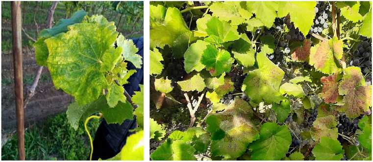 Рис. 1. Типичные симптомы проявления вируса GLRaV-3 на красном сорте винограда ( Vitis vinifera L.) Кара Шаны (слева) и белом сорте Баяншира (справа) . Фотографии сделаны автором в 2023 году в рамках проведения фитосанитарного мониторинга в регионе Шамахы.