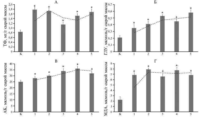Рис. 2. Содержание токоферолов ( ТФ) (А) , восстановленного глутатиона (ГЛУ) (Б) , аскорбиновой кислоты (АК) (В) и малонового диальдегида (МДА) (Г) в здоровых (К) и инфицированных GLRaV-3 (1-5) листьях винограда ( Vitis vinifera L.) сорта Кара Шаны ( n = 3, M ±SD, Ша-махинский регион, период вегетации, 2023 год). Инфицированные варианты отобраны на основании полуквантитативной оценки вирусной нагрузки методом DAS-ELISA (E 405 ): 12 — низкий уровень, 3 — средний, 4-5 — высокий. Пунктирная линия иллюстрирует общую тенденцию изменения исследуемого параметра при возрастании степени инфекции.
