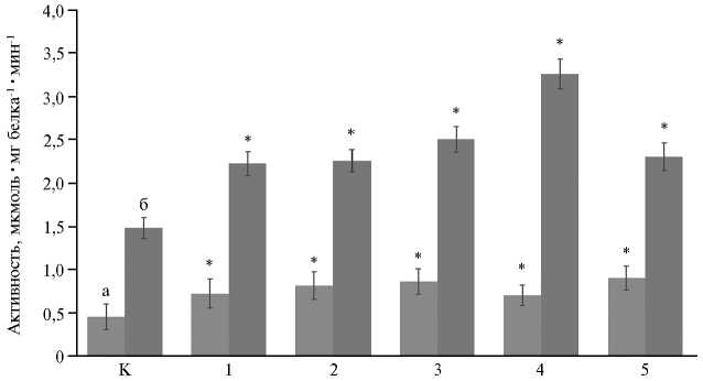 Рис. 3. Активность аскорбатпероксидазы (а) и каталазы (б) в здоровых (К) и инфицированных GLRaV-3 (1-5) листьях винограда ( Vitis vinifera L.) сорта Кара Шаны ( n = 3, M ±SD, Шама-хинский регион, период вегетации, 2023 год) . Инфицированные варианты отобраны на основании полуквантитативной оценки вирусной нагрузки методом DAS-ELISA (E 405 ): 1-2 — низкий уровень, 3 — средний, 4-5 — высокий.