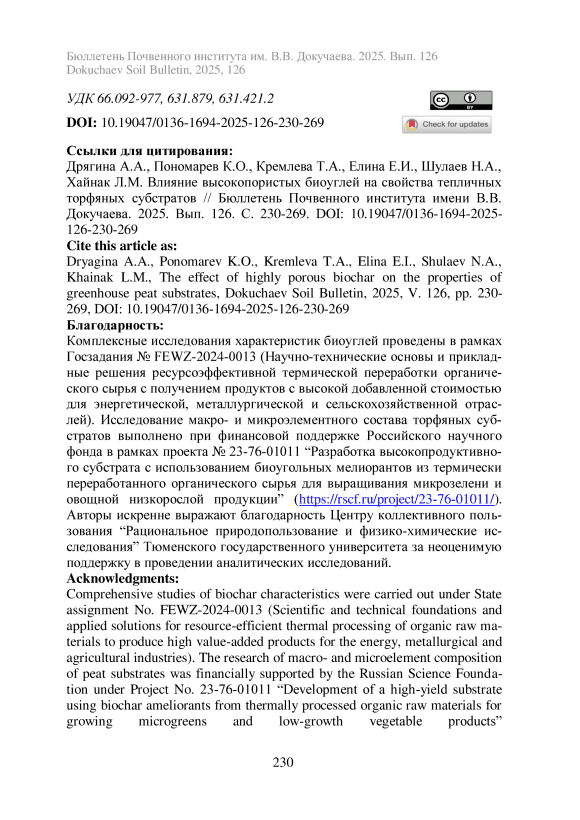 Влияние высокопористых биоуглей на свойства тепличных торфяных субстратов
