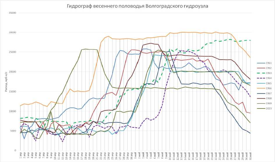 Рис. 2. График сбросных расходов Волжской ГЭС в период весеннего половодья 1961–1969 гг.