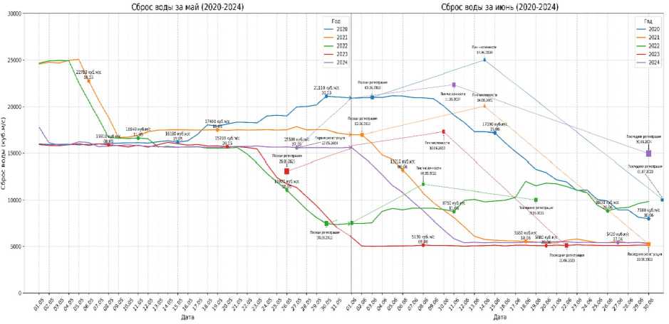 График сбросных расходов Волжской ГЭС в период 2020–2024 гг. представлен на рисунке 3.