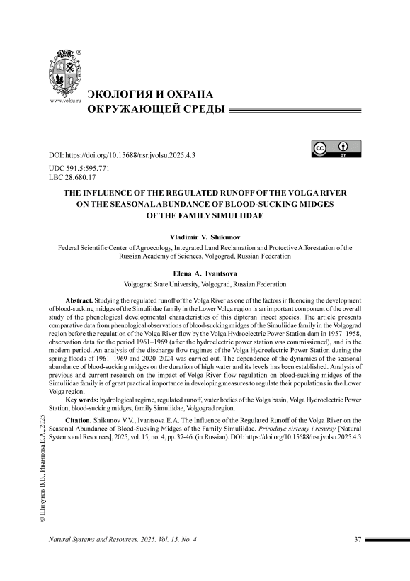 Изучение зарегулированного стока р. Волга, как одного из факторов, влияющего на развитие кровососущих мошек сем. Simuliidae Нижнего Поволжья, является важной составляющей для всего процесса исследования фенологических особенностей развития двукрылых насекомых данного вида. В статье представлены сравнительные данные фенологических наблюдений за кровососущими мошками сем. Simuliidae на территории Волгоградской области до зарегулирования стока р. Волга плотиной Волжской ГЭС в 1957–1958 гг., данные наблюдений за период 1961–1969 гг. (после ввода гидроэлектростанции в эксплуатацию), а также в современный период. Проведен анализ режимов сбросных расходов Волжской ГЭС в период весеннего половодья 1961–1969 гг. и 2020–2024 гг. Установлена зависимость динамики сезонной численности кровососущих мошек от продолжительности половодья и его уровней. Анализ предыдущих и современных исследований, касающихся влияния регулирования стока реки Волга на кровососущих мошек сем. Simuliidae имеет большое практическое значение при разработке мероприятий по регулированию численности их популяций в условиях Нижнего Поволжья.