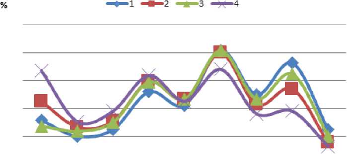 Рисунок 1 – Фракционный состав структуры чернозема выщелоченного (%) на вариантах опыта: 1. Контроль. 2. Жидкая фракция навоза (ЖФН) - 50 т/га. 3. ЖФН - 100 т/га. 4. ЖФН - 200 т/га