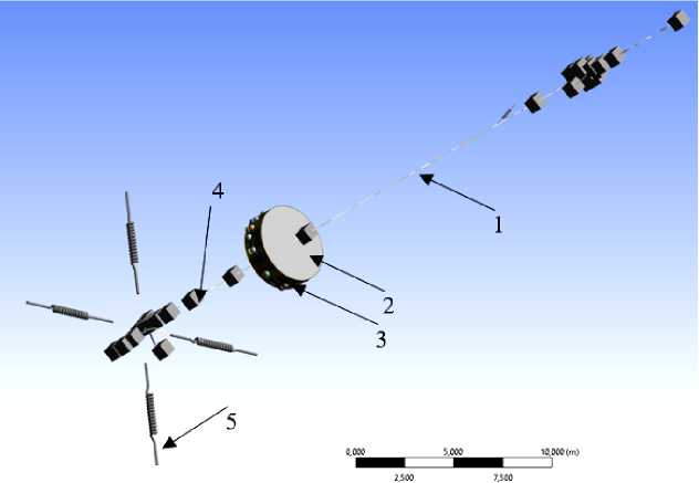 Fig. 1. General view of the FEM of a beam-type launch vehicle with the compartment under study: 1 – beam-type launch vehicle; 2 – air acoustic environment inside the compartment; 3 – compartment body with concentrated masses of instruments; 4 – concentrated masses of the launch vehicle installations and its fuel tanks; 5 – launch vehicle attachment to the launch pad via elastic elements