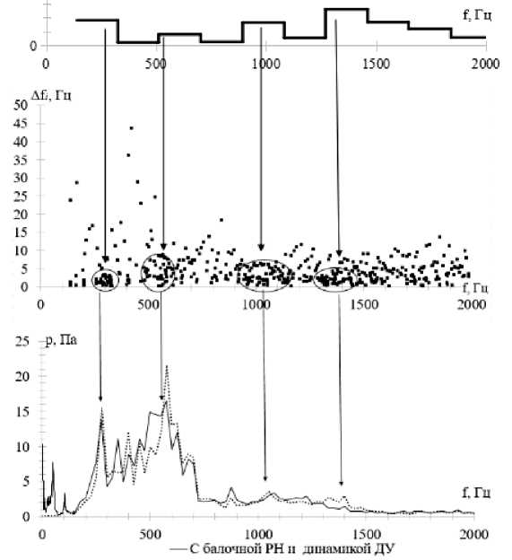 На рис. 5 представлены результаты анализа собственных частот и их влияния на акустическое давление внутри отсека РН. На средней его части изображен разброс величины разности соседних собственных частот Δ fi = fi +1 – fi от частоты fi .