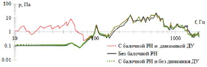 Рис. 4. Расчётный спектр низкочастотного акустического давления внутри отсека с учётом балочной части РН и низкочастотных колебаний, вызванных работой ДУ и отсека без балочной части жёстко зафиксированного на торцевых шпангоутах: