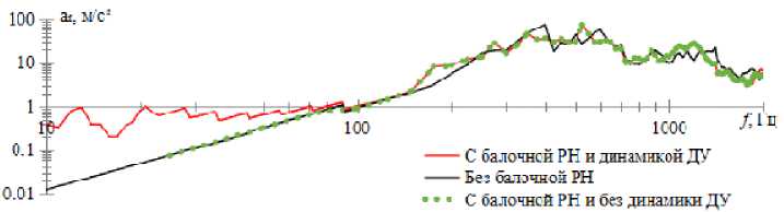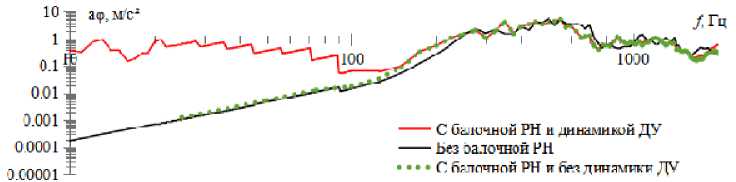 1) балочные модели (с учетом работы ДУ и без ее учета) показали одинаковые значения исследуемых параметров на высоких частотах. На низких частотах до 80 Гц для параметра R и a r и до 150 Гц для параметра a φ и a z возникают существенные расхождения, вызванные упругими колебаниями корпуса РН на низких частотах, обусловленные работой ДУ;
