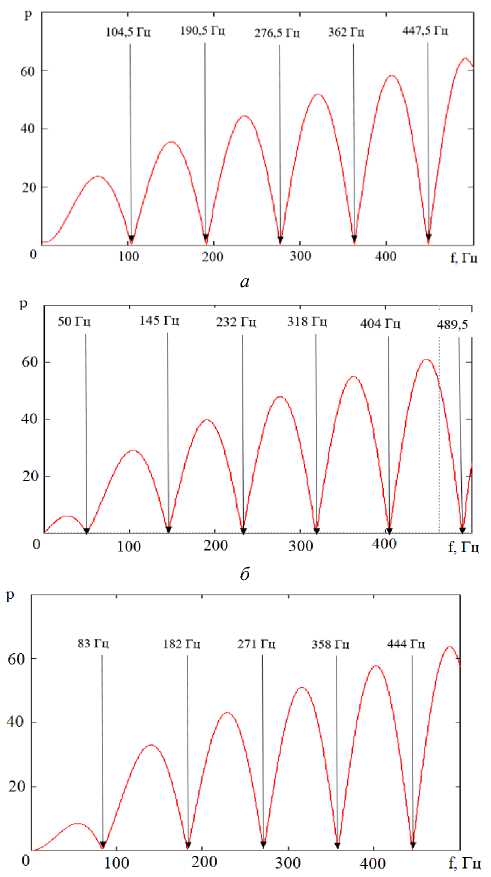 Из полученных данных, представленных на рис. 5, можно отметить, что резонансы в спектре внутреннее акустическое давление в окрестности частот 275, 575, 1050 и 1400 Гц являются следствием повышенных значений величины P.