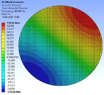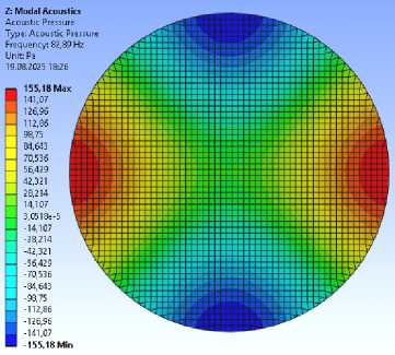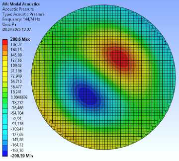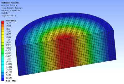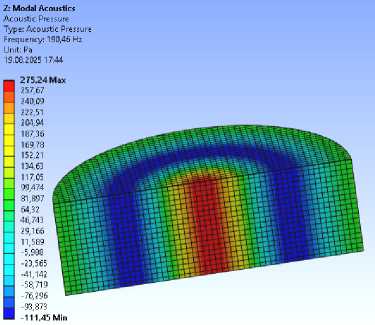 2) получены собственные частоты и формы колебания среды внутри отсека. Как показали результаты расчётов, представленные на рис. 2–4, основное влияние имеют радиальные частоты 50, 104, 145 Гц, соответствующие нулям функции Бесселя нулевого и первого порядка;