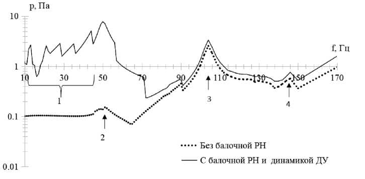 Из рис. 2, 3 видно, что первые две радиальные частоты 50 и 83 Гц соответствуют первым нулям функции Бесселя первого и второго порядка, тогда как первая частота, соответствующая функции Бесселя нулевого порядка, равна 104 Гц, т. е. корень функции нулевого порядка больше, чем первого и второго. На рис. 4 приведен расчётный спектр низкочастотного акустического давления p с учётом влияния балочной части РН с учётом работы ДУ и отсека без балочной части жёстко зафиксированного на торцевых шпангоутах. Результат расчёта для балочной модели до 45 Гц представляет собой «пилообразную» форму в следствие того, что вибрации от ДУ задавались в виде осредненных в диапазонах частот значений виброперемещений. В соответствии с рис. 2 и 3 можно сделать вывод, что резонанс (2) на рис. 4 обусловлен радиальной формой колебания на частоте 50 Гц, соответствующей первому корню функции Бесселя первого порядка, резонанс (3) возникает из-за влияния радиальной формы колебания на частоте 104 Гц, соответствующей первому корню функции Бесселя нулевого порядка, резонанс (4) обусловлен радиальной формой колебания на частоте 145 Гц, соответствующей второму корню функции Бесселя первого порядка.