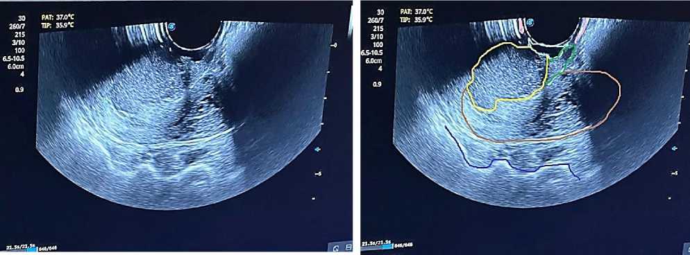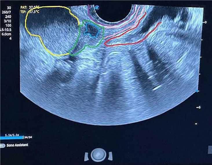 Рисунок 1. Трансвагинальное исследование. Поперечное сканирование (Желтая линия – опухоль шейки матки; Розовая линия – влагалище; Темно-синияя линия инвазия; Горчичная линия – опухолевая инфильтрация; Зеленая линия - опухолевая инфильтрация верхней трети влагалища)