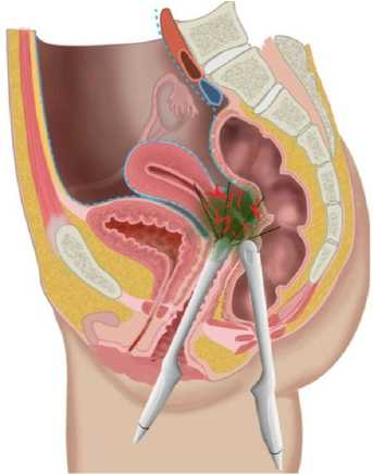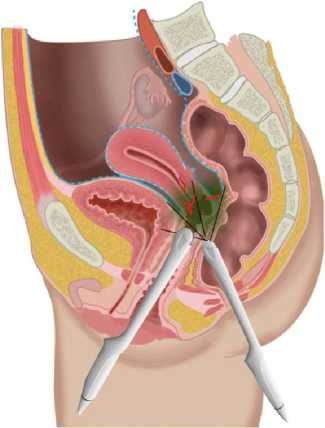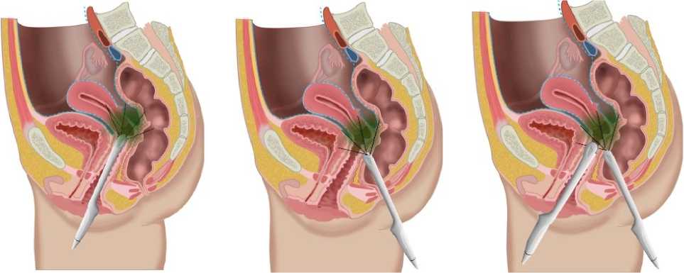 Рисунок 2. а) вагинальное исследование; б) ректальное исследование; в) ректо-вагинальное исследование