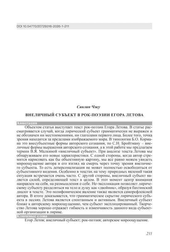 Объектом статьи выступает текст рок-поэзии Егора Летова. В статье рассматривается случай, когда лирический субъект грамматически не выражен и не обозначен ни местоимениями, ни глаголами первого лица. Более того, точка зрения находится за пределами изображаемого мира. В типологии Б.О. Кормана это внесубъектные формы авторского сознания, по С.Н. Бройтману – внеличные формы выражения авторского сознания, а в этой работе мы предлагаем термин В.Я. Малкиной «внеличный субъект». При анализе текста Летова мы обнаруживаем его новые характеристики. С одной стороны, когда автор стремится нарисовать как бы объективную картину, мы все равно можем увидеть мироощущение автора и его взгляд на смерть через точку зрения внеличнего субъекта. То есть деперсонализация не может полностью освободиться от субъективного видения. Особенно в текстах на тему природных явлений такая ситуация встречается очень часто. С другой стороны, внеличный субъект является силой, определяющей текст в целом. В этот момент центр внимания направлен на себя, на размышления о себе. Не-экспликация позволяет лирическому субъекту разделяться на тело и душу как «двойник», образуя бахтинский диалог в тексте. Это полифоническое явление также является саморефлексией автора. В итоге доказывается, что грамматическое скрытие лирического субъекта в песнях Летова является спонтанным и активным. Внеличный субъект ближе к авторскому мироощущению, чем субъект эксплицированный. Творчество Летова хорошо отражает гибкость и изменчивость данного вида субъектной организации в лирике.