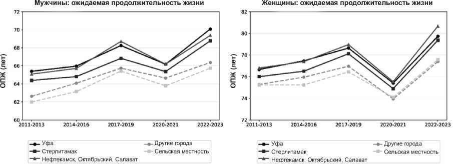 По мужскому населению наибольшее повышение ожидаемой продолжительности жизни наблюдалось в Уфе (на 3,91 года в среднем за год, при этом только группа 65+ лет дала вклад +2,36 года), что почти полностью компенсировало потери пандемийного периода. Наименьшее повышение было в сельской местности (на 1,96 года в среднем за год, при этом группа 65+ лет дала вклад +1,14 года).