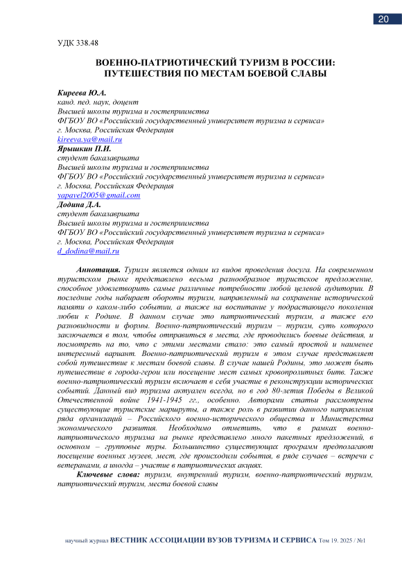 Туризм является одним из видов проведения досуга. На современном туристском рынке представлено весьма разнообразное туристское предложение, способное удовлетворить самые различные потребности любой целевой аудитории. В последние годы набирает обороты туризм, направленный на сохранение исторической памяти о каком-либо событии, а также на воспитание у подрастающего поколения любви к Родине. В данном случае это патриотический туризм, а также его разновидности и формы. Военно-патриотический туризм – туризм, суть которого заключается в том, чтобы отправиться в места, где проводились боевые действия, и посмотреть на то, что с этими местами стало: это самый простой и наименее интересный вариант. Военно-патриотический туризм в этом случае представляет собой путешествие к местам боевой славы. В случае нашей Родины, это может быть путешествие в города-герои или посещение мест самых кровопролитных битв. Также военно-патриотический туризм включает в себя участие в реконструкции исторических событий. Данный вид туризма актуален всегда, но в год 80-летия Победы в Великой Отечественной войне 1941-1945 гг., особенно. Авторами статьи рассмотрены существующие туристские маршруты, а также роль в развитии данного направления ряда организаций – Российского военно-исторического общества и Министерства экономического развития. Необходимо отметить, что в рамках военно-патриотического туризма на рынке представлено много пакетных предложений, в основном – групповые туры. Большинство существующих программ предполагают посещение военных музеев, мест, где происходили события, в ряде случаев – встречи с ветеранами, а иногда – участие в патриотических акциях.