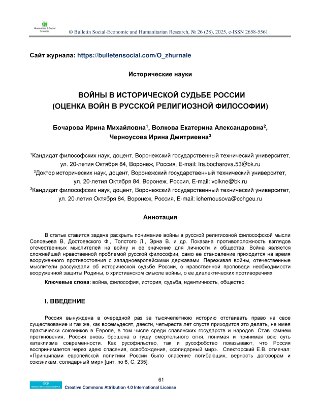 Текст научной статьи Войны в исторической судьбе России (оценка войн в русской религиозной философии)