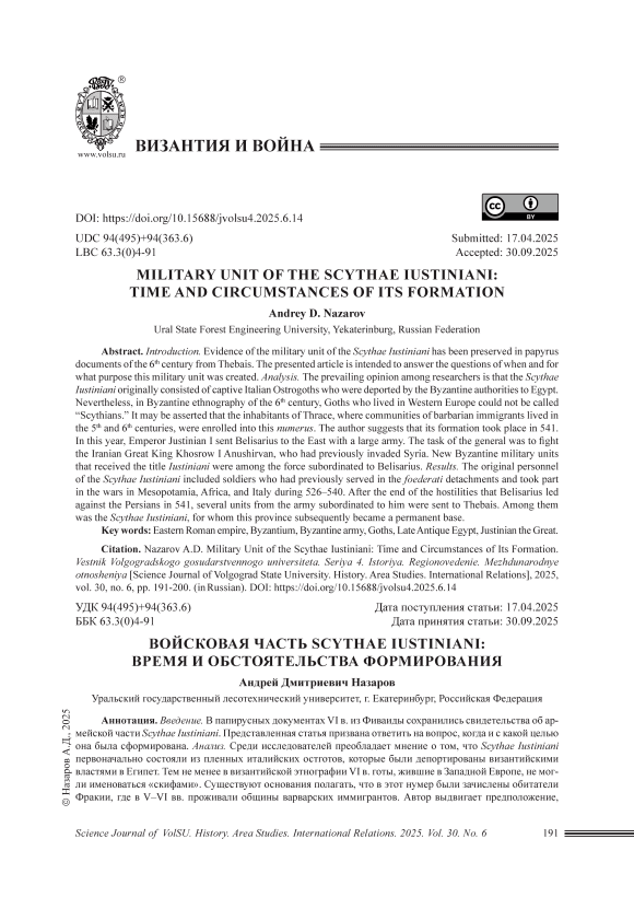 Введение. В папирусных документах VI в. из Фиваиды сохранились свидетельства об армейской части Scythae Iustiniani. Представленная статья призвана ответить на вопрос, когда и с какой целью она была сформирована. Анализ. Среди исследователей преобладает мнение о том, что Scythae Iustiniani первоначально состояли из пленных италийских остготов, которые были депортированы византийскими властями в Египет. Тем не менее в византийской этнографии VI в. готы, жившие в Западной Европе, не могли именоваться «скифами». Существуют основания полагать, что в этот нумер были зачислены обитатели Фракии, где в V–VI вв. проживали общины варварских иммигрантов. Автор выдвигает предположение, что его формирование было осуществлено в 541 году. Именно в этом году Юстиниан I отправил на Восток Велисария со значительными силами. Задача военачальника заключалась в ведении боевых действий против шаханшаха Хосрова I Ануширвана, который перед этим вторгся в Сирию. В подчинении у Велисария находились в том числе новые армейские части, получившие титул Iustiniani. Результаты. В первоначальный состав Scythae Iustiniani вошли бойцы, которые ранее служили в отрядах федератов и принимали участие в войнах в Месопотамии, Африке и Италии в 526–540 годах. После окончания боевых действий, которые Велисарий вел против персов в 541 г., несколько войсковых частей из подчиненных ему сил было отправлено в Фиваиду. Среди них находились и Scythae Iustiniani, для которых эта провинция стала местом постоянного базирования.