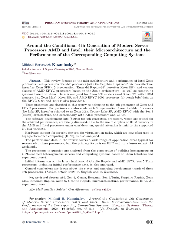Обзор посвящен особенностям микроархитектуры и производительности процессоров Intel Xeon — масштабируемых процессоров 4-го поколения (c микроархитектурой Sapphire Rapids-SP, далее Xeon SPR), 5-го поколения (Emerald Rapids-SP, далее Xeon EMR), и разных классов процессоров AMD EPYC архитектуры Zen 4, а также вычислительным системам на их основе. Анализируются данные о моделях Xeon SPR (и Xeon SPR с памятью HBM, то есть Xeon Max), Xeon EMR и процессорax AMD EPYC 9004 (хотя приведены и краткие данные о EPYC 8004 и 4004). Эти процессоры отнесены в обзоре к условному 4-му поколению Xeon и EPYC. Сопоставления проводятся и с масштабируемыми процессорами Xeon 3-го поколения — Ice Lake-SP (далее Xeon ICL), Cooper Lake-SP, с AMD EPYC с архитектурой Zen 3 (Milan), а также иногда с процессорами ARM-архитектуры и GPU. Кратко обсуждаются средства разработки программ (SDK) для процессоров 4-го поколения, имеющие важное значение для достигаемой производительности. В связи с применением чиплетов или использованием HBM-памяти в рассматриваемых процессорах AMD и Intel особое внимание обращается на поддерживаемые варианты NUMA. Анализируется также аппаратная поддержка средств обеспечения безопасности для задач виртуализации, которые теперь часто применяются и в области высокопроизводительных вычислений (HPC). Данные о производительности в обзоре охватывают широкий спектр областей применения, характерных для серверов с этими процессорами. Но основное внимание уделяется HPC и, в меньшей степени, задачам ИИ. Рассматриваемые процессоры анализируются с точки зрения построения с ними гомогенных или содержащих GPU гетерогенных серверов и вычислительных систем на их основе (кластеров и суперкомпьютеров). Анализируется также начальная информация о новейших процессорах Intel Xeon 6 Granite Rapids и AMD EPYC Zen 5 Turin, включая первые данные об их производительности. Сделаны выводы общего характера о состоянии и образовавшихся тенденциях развития таких процессоров x86.