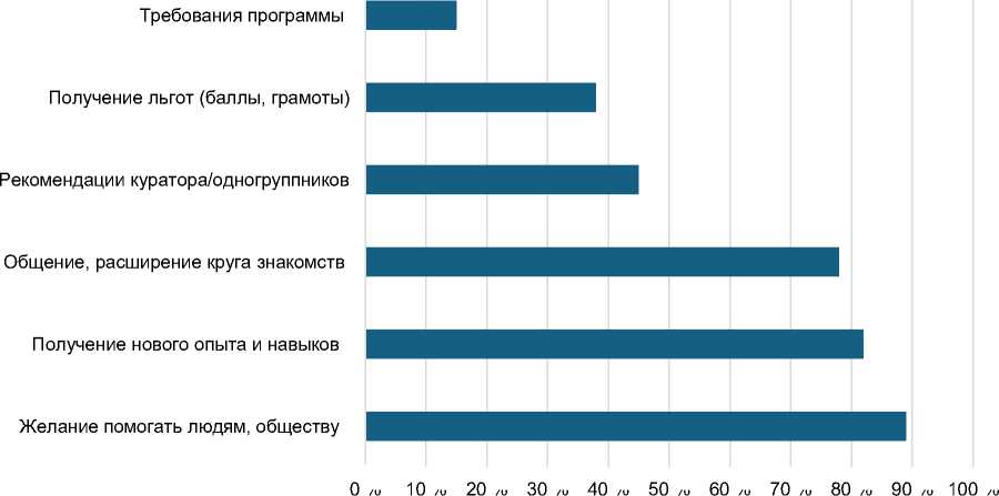 Анализ анкет позволил выявить структуру мотивов участия студентов в волонтерской деятельности (рисунок 1). Доминируют альтруистические и инструментальные мотивы («помощь людям», «новые навыки»), что подтверждает воспитательный и профессионально-развивающий потенциал деятельности.