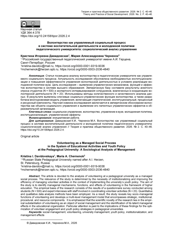 Статья посвящена анализу волонтерства в педагогическом университете как управляемого социального процесса. Актуальность исследования обусловлена необходимостью институционализации и повышения эффективности управления волонтерской деятельностью в условиях реализации молодежной политики вуза. Цель исследования – выявление управленческих механизмов, функций и эффектов волонтерства в системе высшего образования. Эмпирическую базу составили результаты анкетного опроса студентов (N = 500) и экспертного интервьюирования сотрудников, вовлеченных в координацию волонтерской деятельности (N = 20). Использованы методы количественного и качественного анализа данных. В результате выявлены ключевые социально-управленческие функции волонтерства, а также разработана многоуровневая модель управления, включающая стратегический, институциональный, процессный и ресурсный компоненты. Научная новизна исследования заключается в эмпирическом обосновании волонтерства как объекта социального управления и выявлении его латентных управленческих эффектов в образовательной организации.