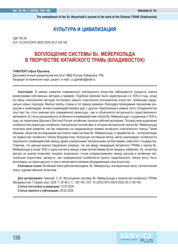 В рамках развития современного театрального искусства наблюдаются процессы поиска режиссерами собственных методов и приемов. Подобное явление было характерным и в 1920‑е годы, когда на смену классических методов постановок пришло новаторское агитационное искусство, требующее кардинально новых подходов. Многие театры страны в тот период времени, благодаря проводимым творческим конкурсам и олимпиадам, активно взаимодействовали друг с другом. Накопленный в рамках этого сотрудничества опыт мог бы стать важным для современной режиссуры, чем и объясняется актуальность представленного материала. В статье раскрываются особенности взаимодействия театра Вс. Мейерхольда с созданным в 1930‑е годы на территории Дальнего Востока России китайским театром рабочей молодежи. Посредством выделения особенностей режиссуры китайского театрального коллектива, в котором методология театра Вс. Мейерхольда получила свое развитие, так как опиралась на традиционные приемы китайского классического театра. Таким образом, объектом исследования выступила сама система Вс. Мейерхольда, а предметом ее – интерпретация на подмостках китайского театра Владивостока. Используя системный метод, автор анализирует особенности творческого взаимодействия между двумя уникальными театральными коллективами советского государства. Отметим, что данный анализ предпринят впервые, так как ввиду ликвидации Китайского ТРАМа и театра Вс. Мейерхольда в конце 1930‑х годов контакты между этими коллективами были преданы забвению. Но, на взгляд автора, их анализ позволяет показать возможные «точки соприкосновения» между русским и китайским театральным искусством, раскрыть, как традиционные особенности одного национального театра могут быть воплощены на сцене другого, в чем и заключается великая объединяющая сила искусства.