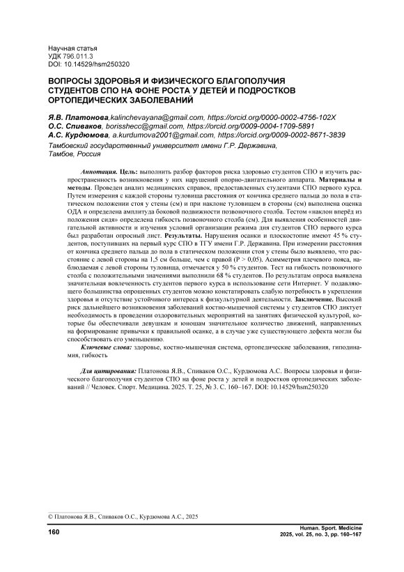 Анализ состояния здоровья российских школьников и подростков позволил ученым выделить высокую распространенность в отношении заболеваний опорно-двигательной системы, среди которых отдельные варианты нарушений осанки и плоскостопие. Согласно научным источникам, нарушения осанки у студентов СПО составляют 40,4 % (доля сколиоза - 34,8 %), плоскостопие - 40 %) [3]. Другим исследованием установлено, что нарушения осанки разной формы и степени тяжести имеют от 76 до 78 % студентов СПО. Плоскостопие зафиксировано у 66 % студентов младших курсов и 81 % - старших [1].