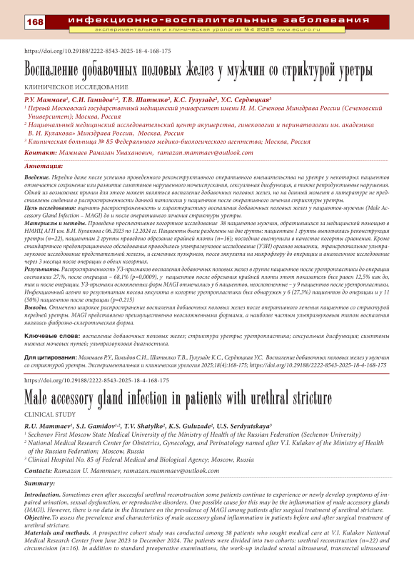 У части пациентов после уретропластики для восстановления достаточной для свободного мочеиспускания проходимости уретры сохраняется симптоматика нарушения функции нижних мочевых путей отмечается развитие или усугубление сексуальной дисфункции [1]. Целью ряда исследований стала оценка распространенности данных нарушений и поиск причин их возникновения. Так, в исследовании D.V. Chapman и соавт. было показано наличие остаточных симптомов нарушения мочеиспускания у 7,7% пациентов после оперативного лечения стриктуры уретры [2]. При этом у пациентов с симптомами нарушения функции нижних мочевых путей до операции сохранение симптоматики отмечается в 23,1% случаев [3]. Что касается сексуальной дисфункции после оперативного вмешательства на уретре,то ее развитие обычно обусловлено с анатомическими изменениями связанными с операцией,хирургической травмой и психологическими нарушениями [4]. Возможной причиной этих осложнений может являться воспаление мужских добавочных половых желез (Male Accessory Gland Infection – MAGI). Распространенность воспаления добавочных половых желез в мужской популяции варьирует в достаточно широких пределах от 5 до 30% [5], но в литературе отсутствует информация о распространенности и выраженности MAGI среди пациентов после оперативного лечения стриктуры уретры. К возможным проявлениям воспаления относят не только симптомы со стороны нижних мочевых путей и сексуальную дисфункцию, но и нарушение мужской фертильности [6]. Последнее обстоятельство отражено в том числе в клинических рекомендациях Европейского общества урологов [7].