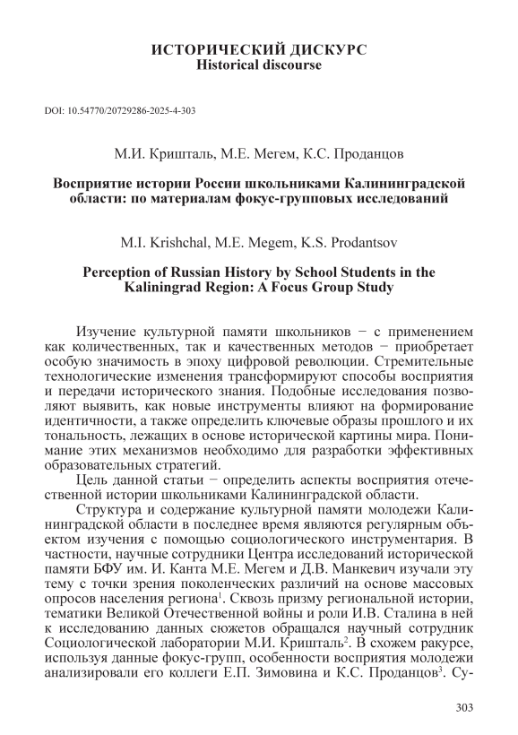 Изучение культурной памяти молодежи приобретает особую актуальность в условиях цифровизации и имеет прикладное значение для разработки образовательных стратегий. В связи с этим целью настоящего исследования является определение аспектов восприятия отечественной истории школьниками Калининградской области. Эмпирической базой исследования стали шесть фокус-групп, проведенных в ноябре 2024 года с участием 48 учащихся 10-х классов общеобразовательных школ региона. Анализ показал, что центральное место в культурной памяти школьников занимает Великая Отечественная война, вызывающая у них амбивалентные эмоции: гордость и радость за победу, но одновременно скорбь по многочисленным потерям. Полет Ю.А. Гагарина и воссоединение Крыма с Россией воспринимаются преимущественно положительно, тогда как распад СССР и Октябрьская революция вызывают смешанные эмоции. В образах исторических периодов также порой наблюдается поляризация. С одной стороны, Российская империя ассоциируется с выдающимися монархами и военным могуществом, с другой – ее аграрным характером, что свидетельствует об отставании. Советский период вызывает одновременно признание военных и экономических достижений и критику репрессивного характера политической системы. В свою очередь, современная Россия связывается с личностью В.В. Путина, его длительным правлением и вкладом в развитие страны. Проведенный анализ иерархии исторических деятелей выявил доминирование государственных правителей (таких как Петр I, В.И. Ленин, И.В. Сталин) над представителями культуры и науки (А.С. Пушкиным, Ю. А. Гагариным). Данная тенденция обусловлена тем, что в сознании учащихся при оценке значимости личности приоритет отдается таким характеристикам, как создание сильного государства, расширений территорий и укрепление международных позиций страны. Основными источниками знаний об истории школьники называют интернет-ресурсы и учебники, но в качестве предпочтительных выделяют визуальные и интерактивные форматы: музеи, экскурсии, художественные фильмы.