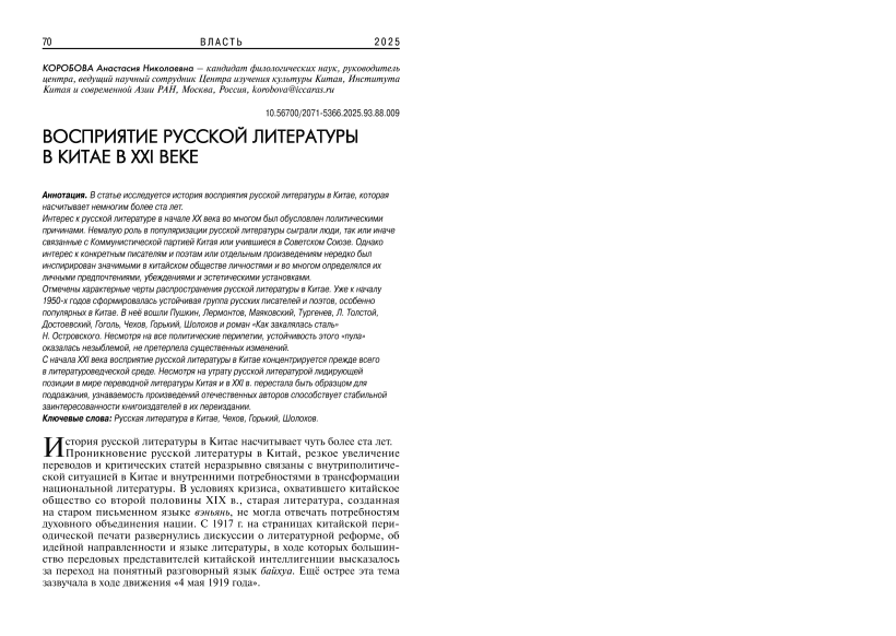 Текст научной статьи Восприятие русской литературы в Китае в XXI веке