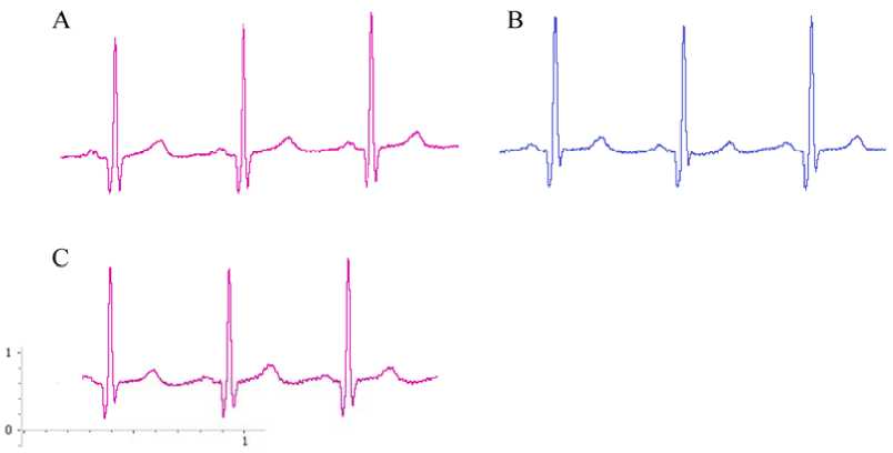 Рис. 1. Оригинальная запись электрокардиограммы киберспортсмена: А – исходный уровень, B – начальная стадия игры, C – сложный игровой момент Fig. 1. Electrocardiogram recording from an esports athlete: