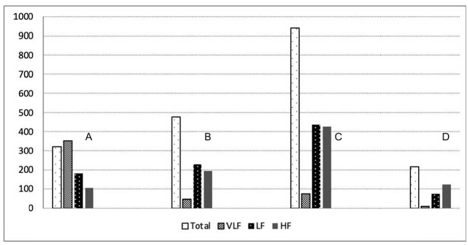 Рис. 2. Динамика основных спектров вариабельности сердечного ритма киберспортсменов во время игры: А – исходный уровень, В – положительные моменты игры, С – отрицательные игровые моменты, D – окончание игры