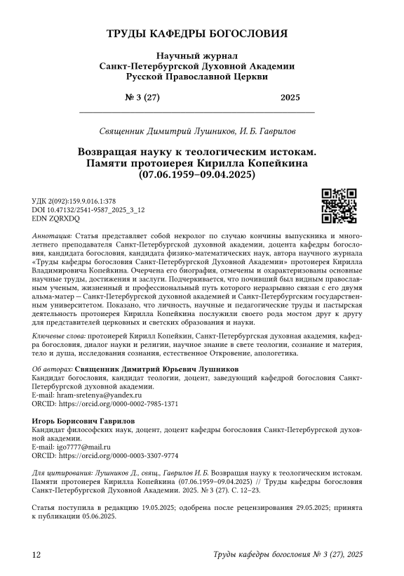 Текст научной статьи Возвращая науку к теологическим истокам. Памяти протоиерея Кирилла Копейкина (07.06.1959–09.04.2025)