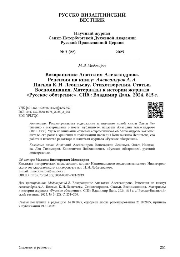 Текст научной статьи Возвращение Анатолия Александрова. Рецензия на книгу: Александров А. А. Письма К. Н. Леонтьеву. Стихотворения. Статьи. Воспоминания. Материалы к истории журнала «Русское обозрение». СПб.: Владимир Даль, 2024. 815 с.