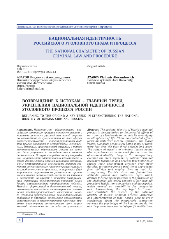 The national identity of Russia’s criminal process is directly linked to the powerful efforts of our country’s leadership to recreate its sovereignty in all spheres of life. These concentrated efforts focus on historical mental, spiritual, and moral values, alongside geopolitical gains, many of which were lost over the past three decades and more. The sphere of activity of criminal justice bodies also experiences an acute need for the assertion of national identity. Purpose: To retrospectively examine the main segments of national criminal procedure legislation and practice that historically shaped their development strategy over many decades, to retrieve proven traditional approaches from oblivion and employ them as tools for strengthening Russia’s state law foundations. Methods: formal and dialectical logic, which allowed for tracing the patterns of the formation of the ideological and moral content of our criminal procedure legislation; comparison and description, which opened up possibilities for comparing and characterizing the key legal institutions that constitute the essence of the national identity of Russia’ criminal process; historical and interpretation of legal norms, used to draw conclusions about the inseparable connection between the psychotype of the Russian population and the paternalistic content of specific institutions, which affirm the historical form of Russia’s mixed criminal process. Results: The study reveals flawed decisions, implemented in the Concept of Judicial Reform in the Russian Federation and the Code of Criminal Procedure of the Russian Federation, which fundamentally distorted the nature of the national criminal process. Drawing upon the legislative and doctrinal achievements of patriotic national legal scholars, the article presents concrete proposals to rectify the imbalances and mistakes introduced in favor of liberal values. These proposals address key areas for strengthening the national identity of criminal justice, including its ideology and objectives, principles, the system-forming role of publicity, and the foundations of evidentiary activity for participants in criminal proceedings.