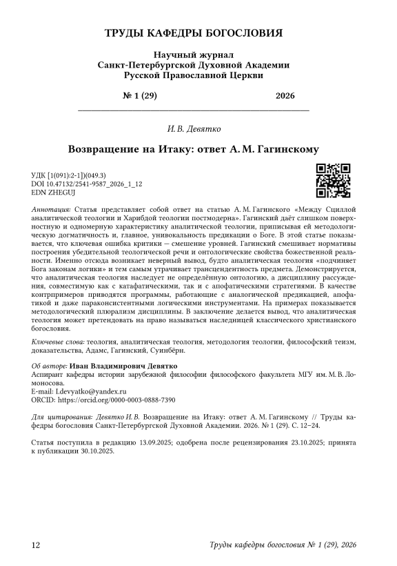 Статья представляет собой ответ на статью А. М. Гагинского «Между Сциллой аналитической теологии и Харибдой теологии постмодерна». Гагинский даёт слишком поверхностную и одномерную характеристику аналитической теологии, приписывая ей методологическую догматичность и, главное, унивокальность предикации о Боге. В этой статье показывается, что ключевая ошибка критики — смешение уровней. Гагинский смешивает нормативы построения убедительной теологической речи и онтологические свой ства божественной реальности. Именно отсюда возникает неверный вывод, будто аналитическая теология «подчиняет Бога законам логики» и тем самым утрачивает трансцендентность предмета. Демонстрируется, что аналитическая теология наследует не определённую онтологию, а дисциплину рассуждения, совместимую как с катафатическими, так и с апофатическими стратегиями. В качестве контрпримеров приводятся программы, работающие с аналогической предикацией, апофатикой и даже параконсистентными логическими инструментами. На примерах показывается методологический плюрализм дисциплины. В заключение делается вывод, что аналитическая теология может претендовать на право называться наследницей классического христианского богословия.