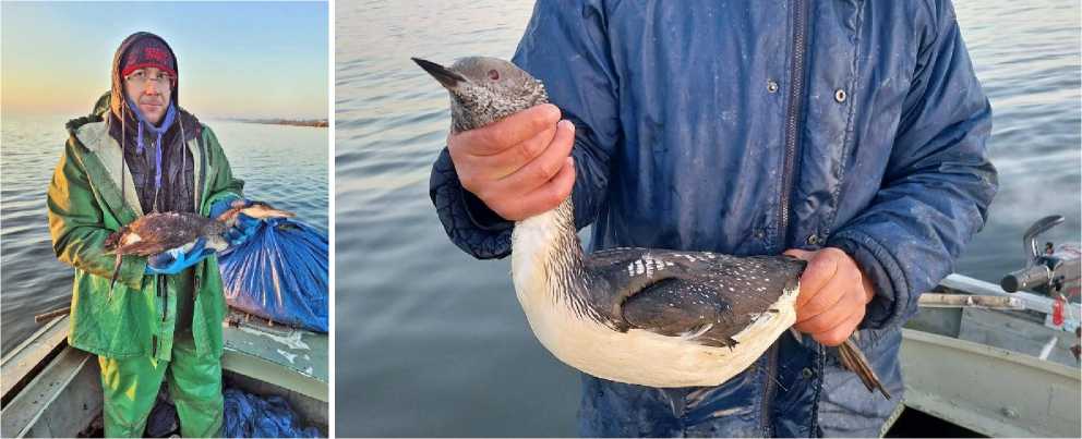 Рис. 1. Спасённые чернозобые гагары Gavia arctica . Слева – гагара в руках у Михаила Мустя, справа – вторая гагара перед выпуском. Кучурганское водохранилище. 14 ноября 2025