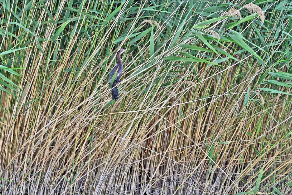 Малый баклан Phalacrocorax pygmeus . 12 июля 2025 два малых баклана рыбачили на акватории заповедника Ягорлык, затем ночевали на стеблях тростника в районе урочища Литвина (рис. 2). Удивляет выбор ими места ночёвки — там часто охотятся коты Felis silvestris . Это свидетельствует о случайности залёта сюда этих бакланов. Одна особь отмечена в заповеднике «Ягорлык» 10 сентября.