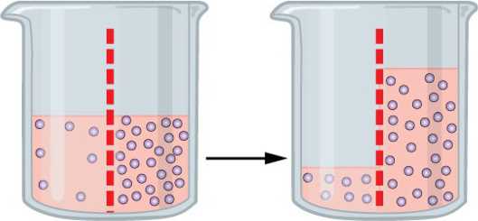 Поскольку в левой части сосуда удельное количество молекул воды больше, чем в правой части, соответственно, количество молекул воды, проникающих в правую часть сосуда, больше. Следовательно, из левой части сосуда в правую часть поступает вода за счёт уменьшения массы воды и, соответственно, внутренней энергии в левой части сосуда, при этом без какого-либо внешнего воздействия – исключительно за счёт уменьшения внутренней энергии левой части сосуда.