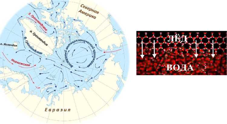 Рис. 3. Схема течений в Северном Ледовитом океане и схема перемещения молекул воды при образовании льда