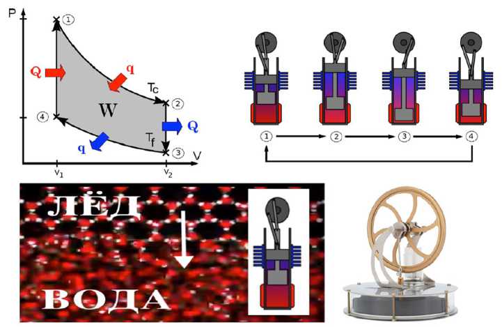 Важную роль в трансформации тепловой энергии в механическую играет принцип двигателя Стирлинга – теории цикла Стирлинга не существовало до появления работы Сади Карно. Карно разработал и опубликовал в 1825 г. общую теорию работы тепловых двигателей – Цикл Карно, из которой следует, что работа двигателя Стирлинга соответствует этой теории. Основное преимущество принципа работы двигателя Стирлинга – возможность преобразовывать в работу любую разницу температур, заключается в постоянно чередуемых нагревании и охлаждении рабочего тела в закрытом цилиндре Двигатель_ Стирлинга). Термодинамический цикл Стирлинга, демонстрационная модель и схема работы двигателя представлены на рис. 4. Схема наглядно демонстрирует возможность получения механической работы в арктической термодинамической системе лёд–вода со среднегодовой усредненной разницей температур льда –12 °C и воды –1,8 °C.