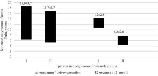 Рис.1. Болевые ощущения по EuraHSQoL в группах исследования до оперативного вмешательства и через 12 месяцев