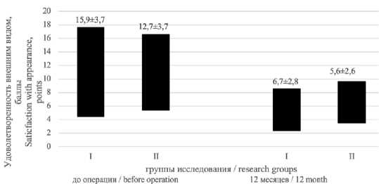 Рис. 3. Удовлетворенность внешним видом по EuraHSQoL в группах исследования до оперативного вмешательства и через 12 месяцев (р ≥ 0,05) Fig. 3. EuraHSQoL satisfaction with appearance in the study groups before and 12 months after surgery (p ≥ 0,05)