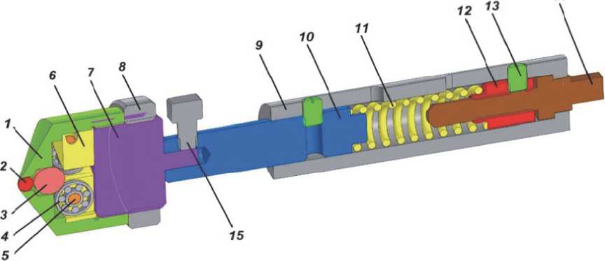 7 – резьбовая крышка с цилиндрическим хвостовиком; 8 – контргайка; 9 – корпус оправки; 10 – ползун; 11 – пружина сжатия; 12 – упорная гайка; 13 –резьбой стержень;