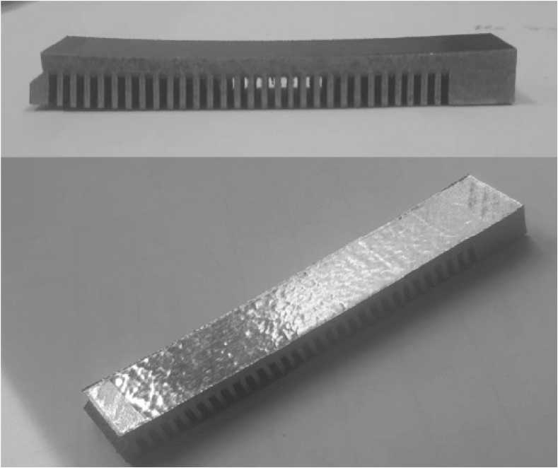 Перед проведением выглаживания образца с криволинейной поверхностью была определена ее исходная шероховатостью. Исследование показало, что шероховатость поверхности образца до выглаживания составила по параметру Ra в поперечном направлении 2,11 мкм и в продольном направлении 1,09 мкм. Как видно, это существенно меньше значений указанных ранее. Уменьшение шероховатости поверхности исходного образца обусловлено тем, что на заключительном этапе его выращивания было выполнено оплавление криволинейной поверхности, т.е. проход по ней лазерным лучом без подачи металлического порошка. Из чего следует, что выполнение такого перехода при осуществлении выращивания способствует снижению величины шероховатости поверхности и сопоставимо с процессом выхаживания при шлифовании.