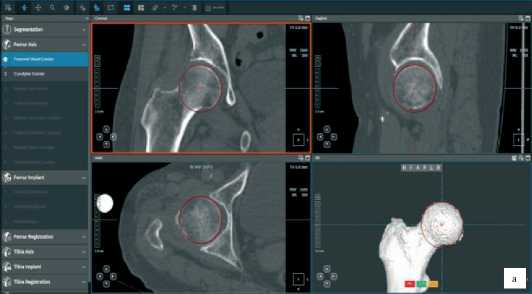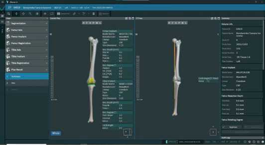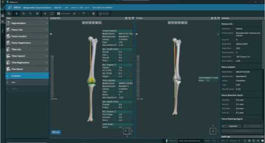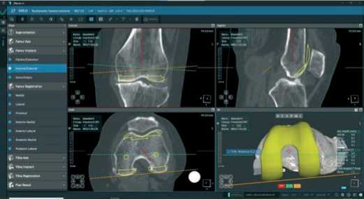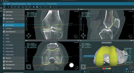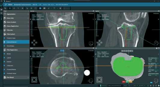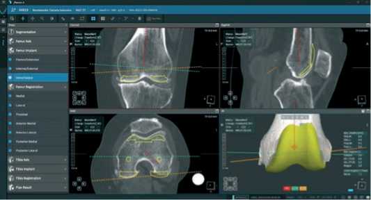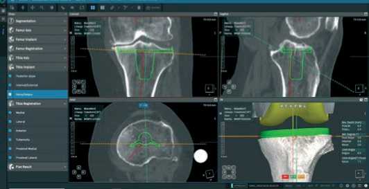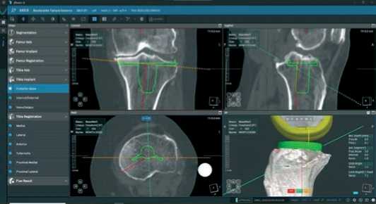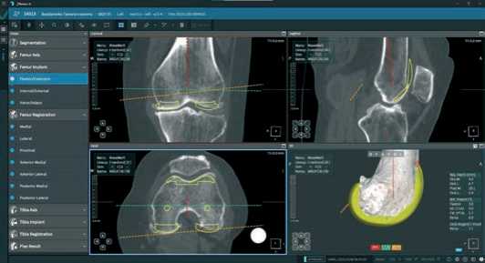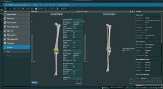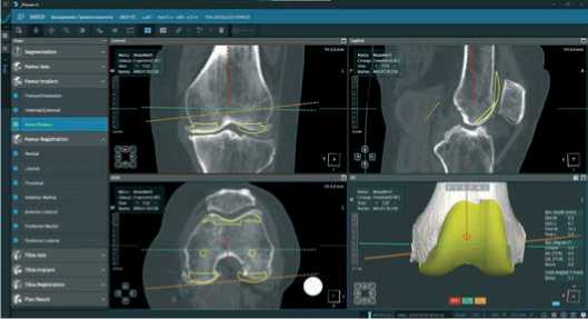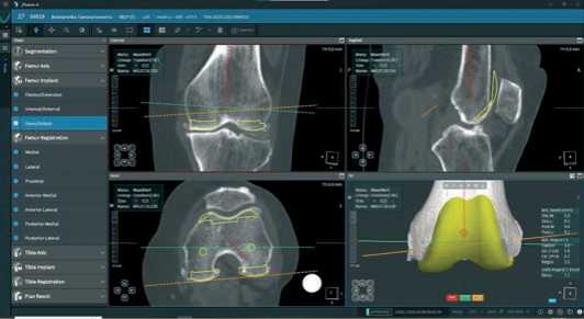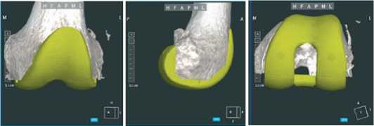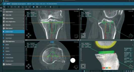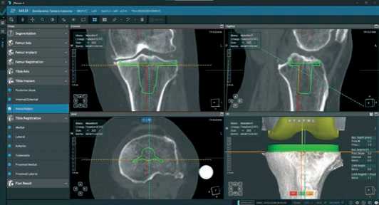 Далее, после построения цифровой модели бедренной и большеберцовой костей пациента, в програмном обеспечении мы выбираем тип и размер планируемого эндопротеза и приступаем к его позиционированию, шаг уровня резекции от 0,1 до 1,0 мм и ротации от 0,1° до 1,0° во всех трех плоскостях (Рисунок 3).