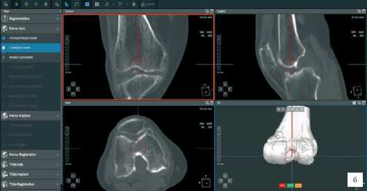 После чего в аксиальной проекции планируется ротация бедренного компонента ориентируясь на трансмыщелковую ось и суставную поверхность надколенника (Рисунок 6).