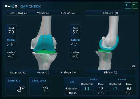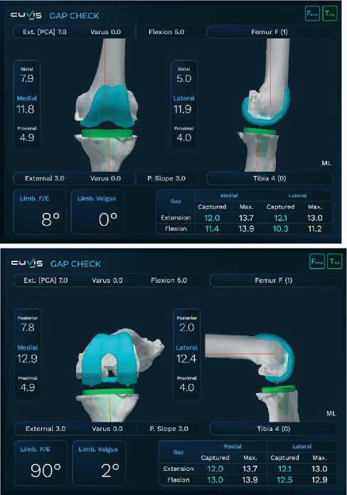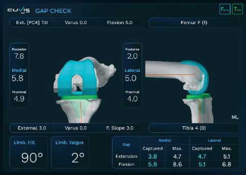Натяжение собственных связок и медиолатеральные щели оцениваются и регистрируются интраоперационно с легким вальгусным и варусным напряжением при разгибании колена и сгибании под углом 90 градусов. Зазоры также оцениваются в режиме реального времени при движении от полного разгибания до полного сгибания коленного сустава для регистрации динамических изменений медиола-теральных щелей (Рисунок 21).